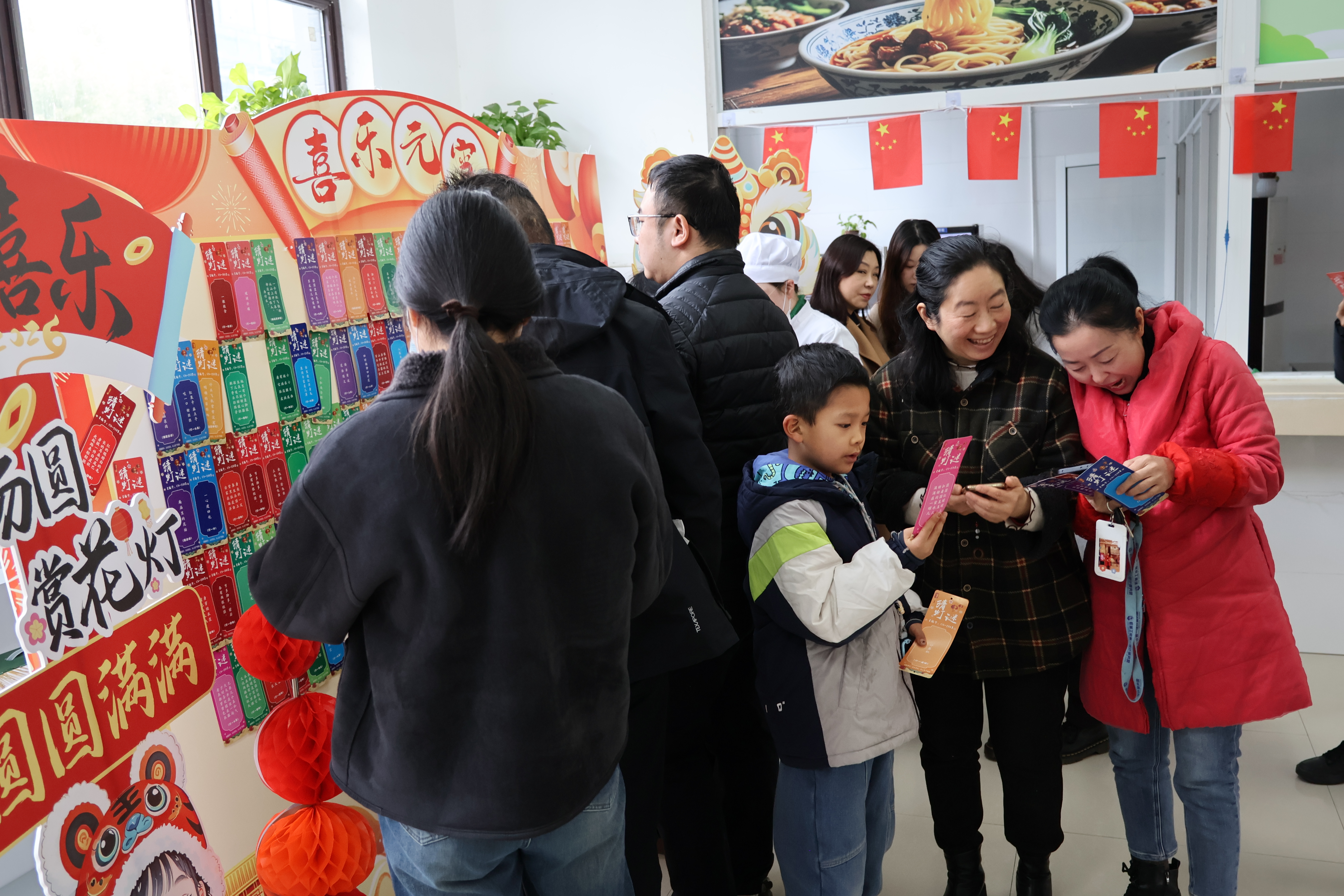 與此同時,“猜燈謎贏好禮” 區域更是熱鬧非凡。五顏六色的燈謎懸掛在食堂內,內容涵蓋傳統文化、生活常識、趣味知識等,既考驗智慧,又增添了節日的趣味性。職工們或駐足思考,或熱烈討論,猜中者喜提精美禮品,笑容洋溢在每個人臉上。