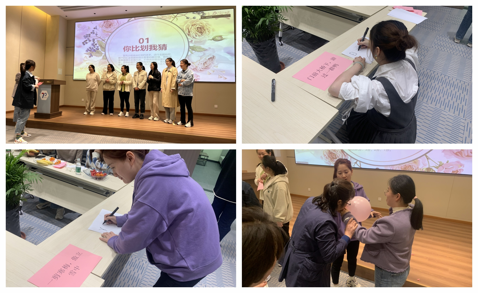 除此之外,今天的系列活動還有“吸管傳鑰匙”、“協(xié)力吹氣球”、“畫畫傳歌詞”,一院的女同胞們不僅鍛煉了“腦力”,也鍛煉了“體力”,同時進一步增進了女性之間團結互助的“合力”,大家在一片熱情洋溢的氛圍中愉悅了身心、舒緩了壓力。